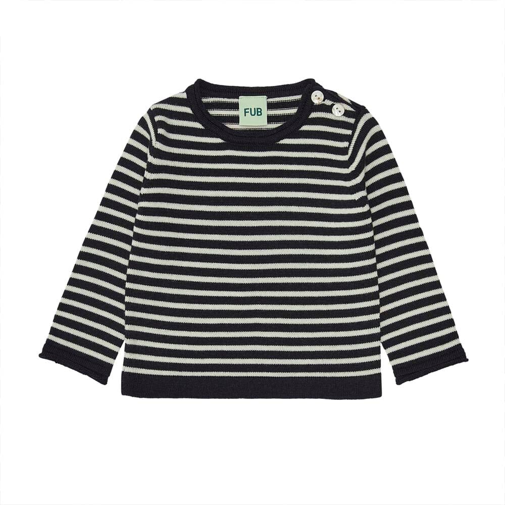 Knitted in single jersey, this long-sleeved blouse is a FUB Classic. Designed with a round neck, a narrow tubular neck-trim and rolling edge at sleeve hems. The sweater has a practical button closure at shoulder with pearl shell buttons, a straight fit and features narrow yarn-dyed stripes all over. Made from extra fine merino wool. FUB's merino wool is BLUESIGN certified, free from harmful chemicals and comes from non-mulesed sheep. 100% OEKOTEX and BLUESIGN certified merino wool