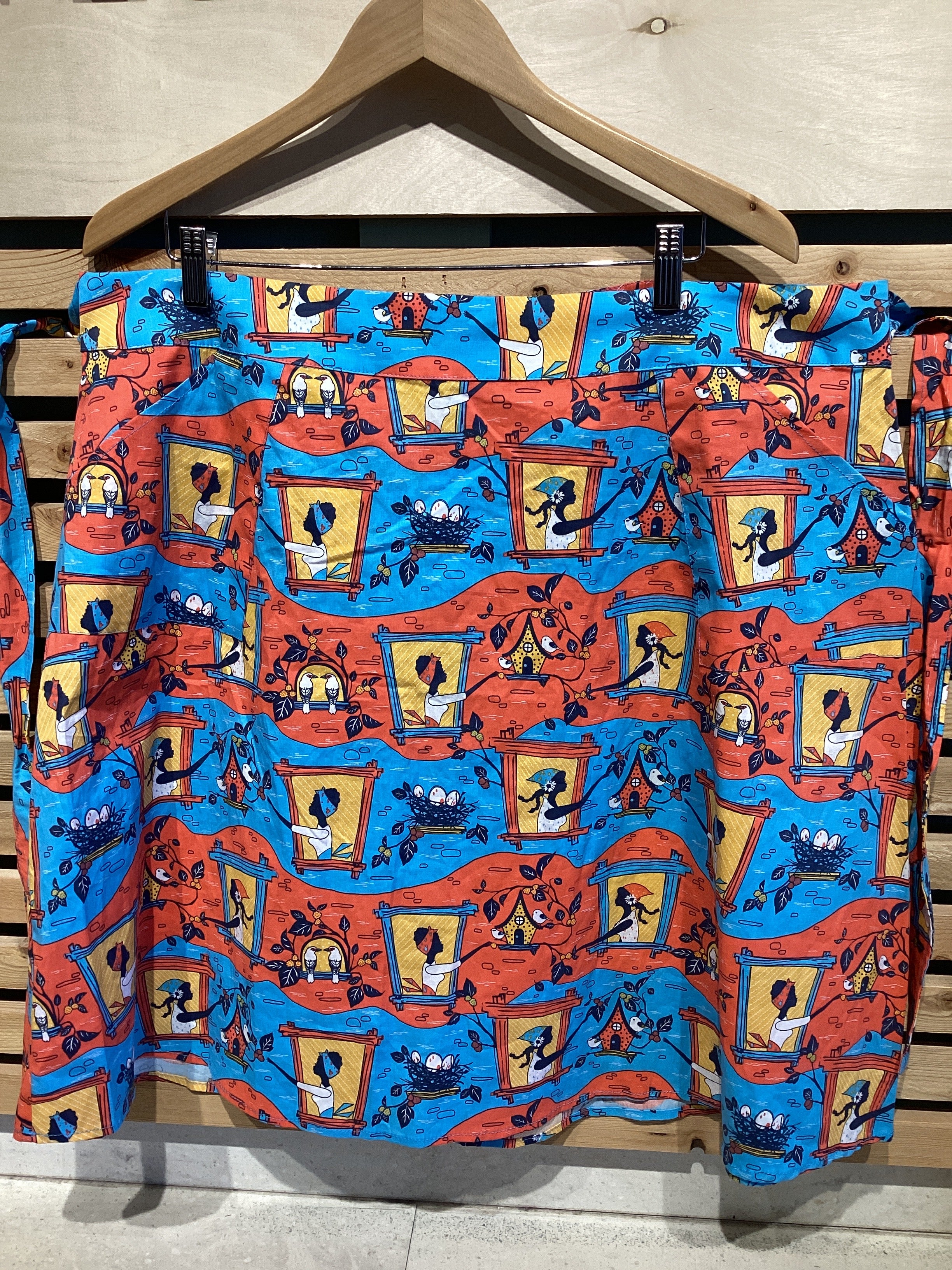 The woven skirt from Blue Platypus features this vintage-inspired print of darling girls feeding the birds and picking berries from the windows of their charming brownstones! This one features front patch pockets, the perfect just above knee length, and ties that can be tied in front or back. The color scheme and print are top sellers, in the most flattering a-line silhouette!