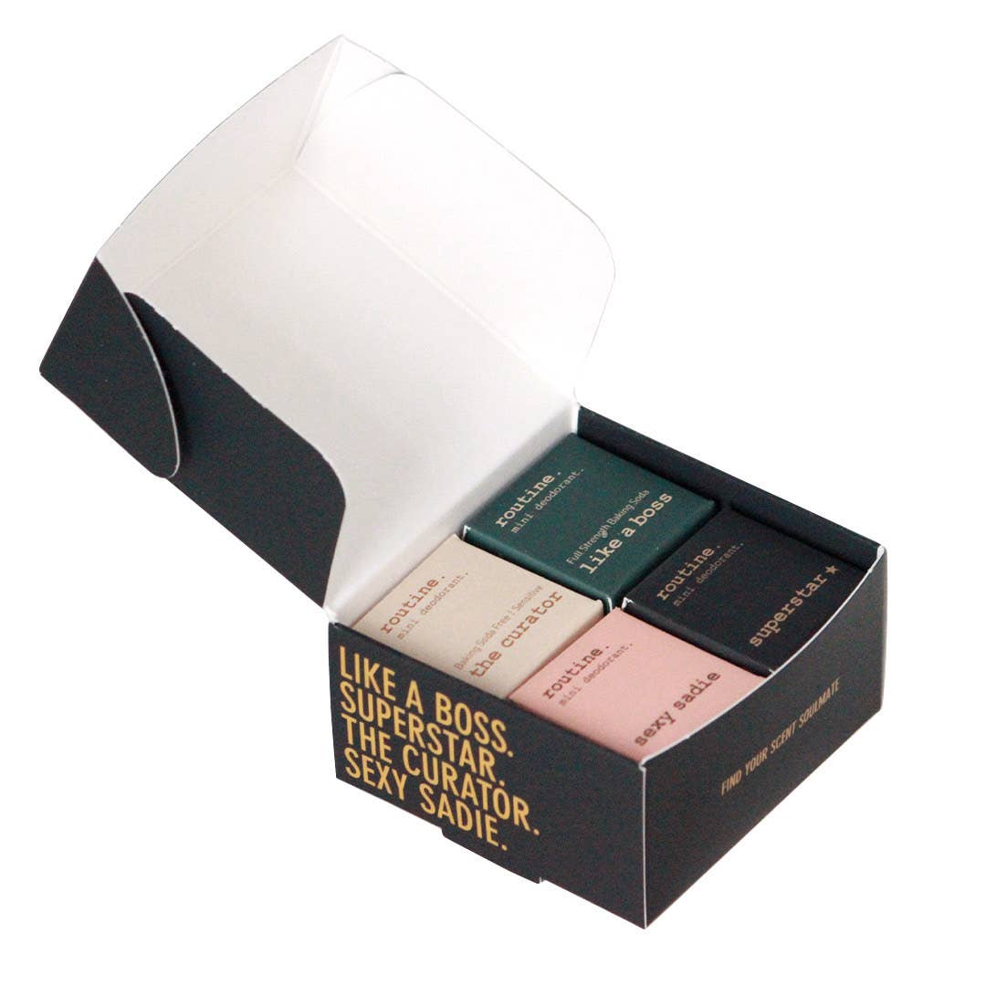 The Curator: cocos nucifera oil, magnesium hydroxide, zea mays (corn) starch (non-gmo), kaolin, maranta arundinacea root powder, cera alba (beeswax), theobroma cacao seed butter, butyrospermum parkii (shea) butter, caprylic/capric triglyceride, tocopherol, olea europaea (olive) fruit oil, cetearyl olivate, sorbitan olivate, brassica glycerides, calendula officinalis flower extract, pelargonium roseum leaf oil (rose geranium), eucalyptus globulus leaf oil, helianthus annuus (sunflower) seed oil, pogostemon cablin oil (patchouli), picea mariana leaf oil (black spruce), theobroma cacao seed extract, rosmarinus officinalis (rosemary) leaf extract, citronellol*, linalol*, limonene*. *naturally occurring in essential oil.