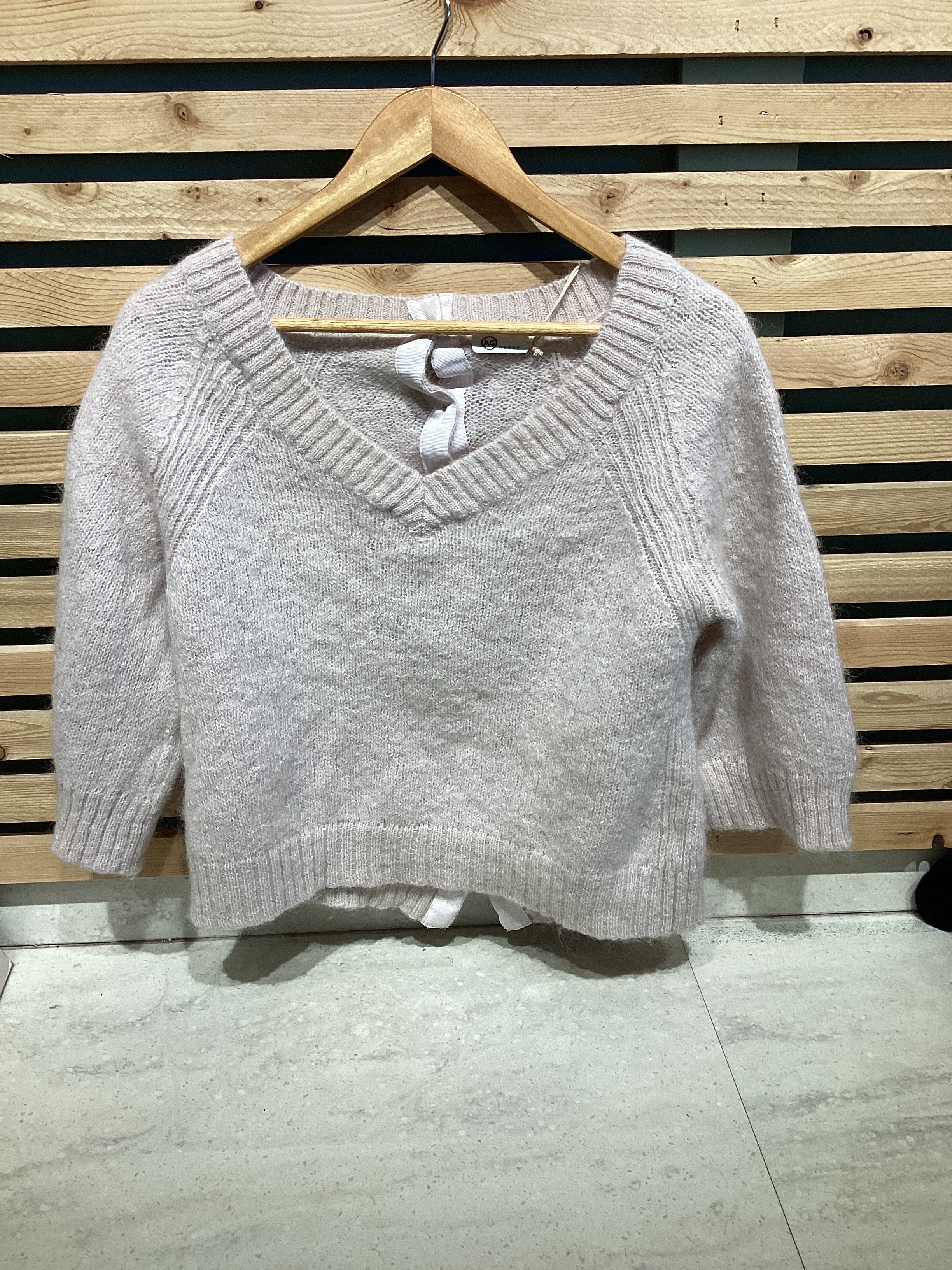 Full back button detail, 3/4 sleeve sweater in light pink