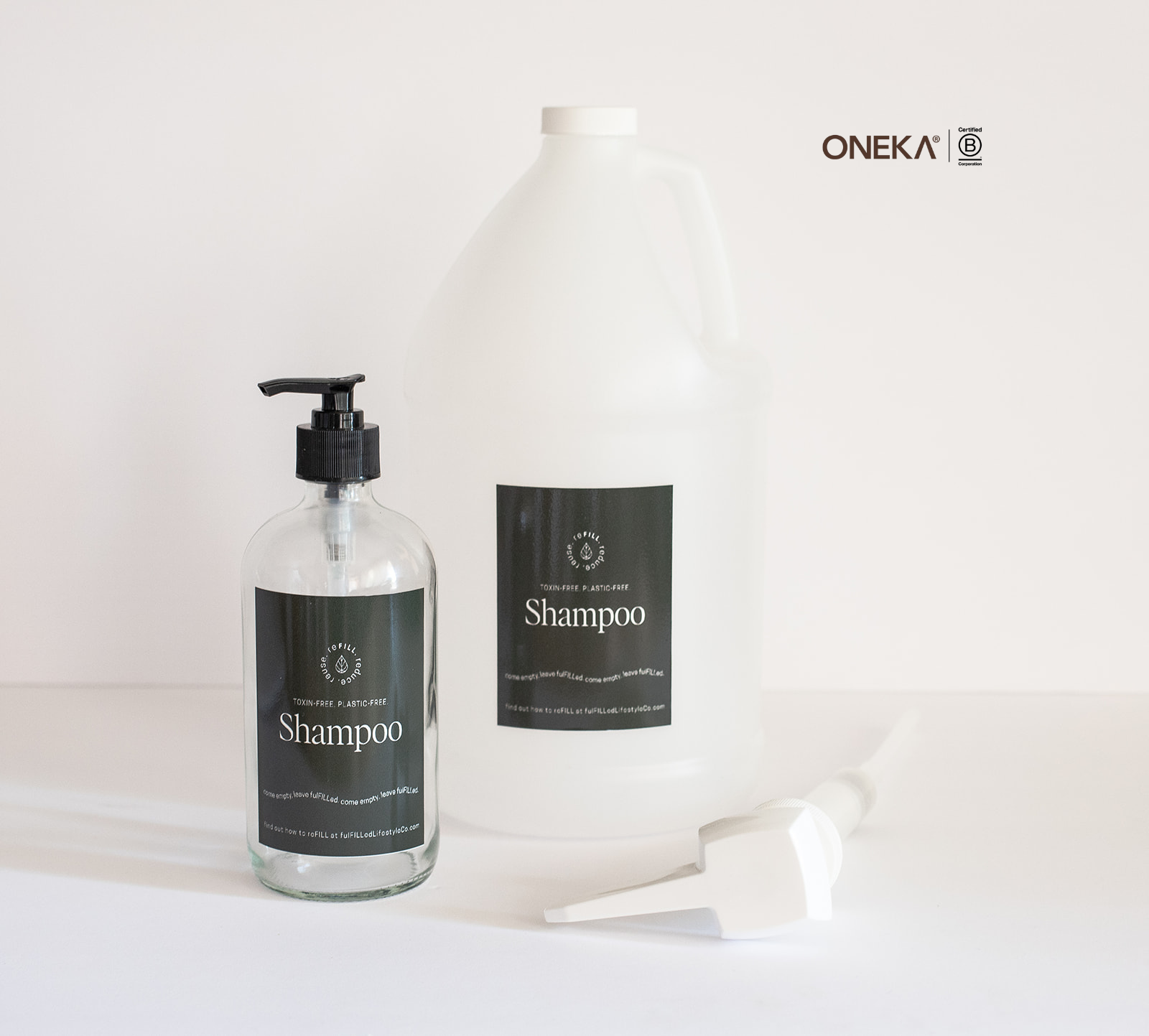 This refill kit includes 1 gallon of Oneka’s botanical shampoo in your choice of scent, along with a 16 oz refillable glass bottle for easy everyday use.
