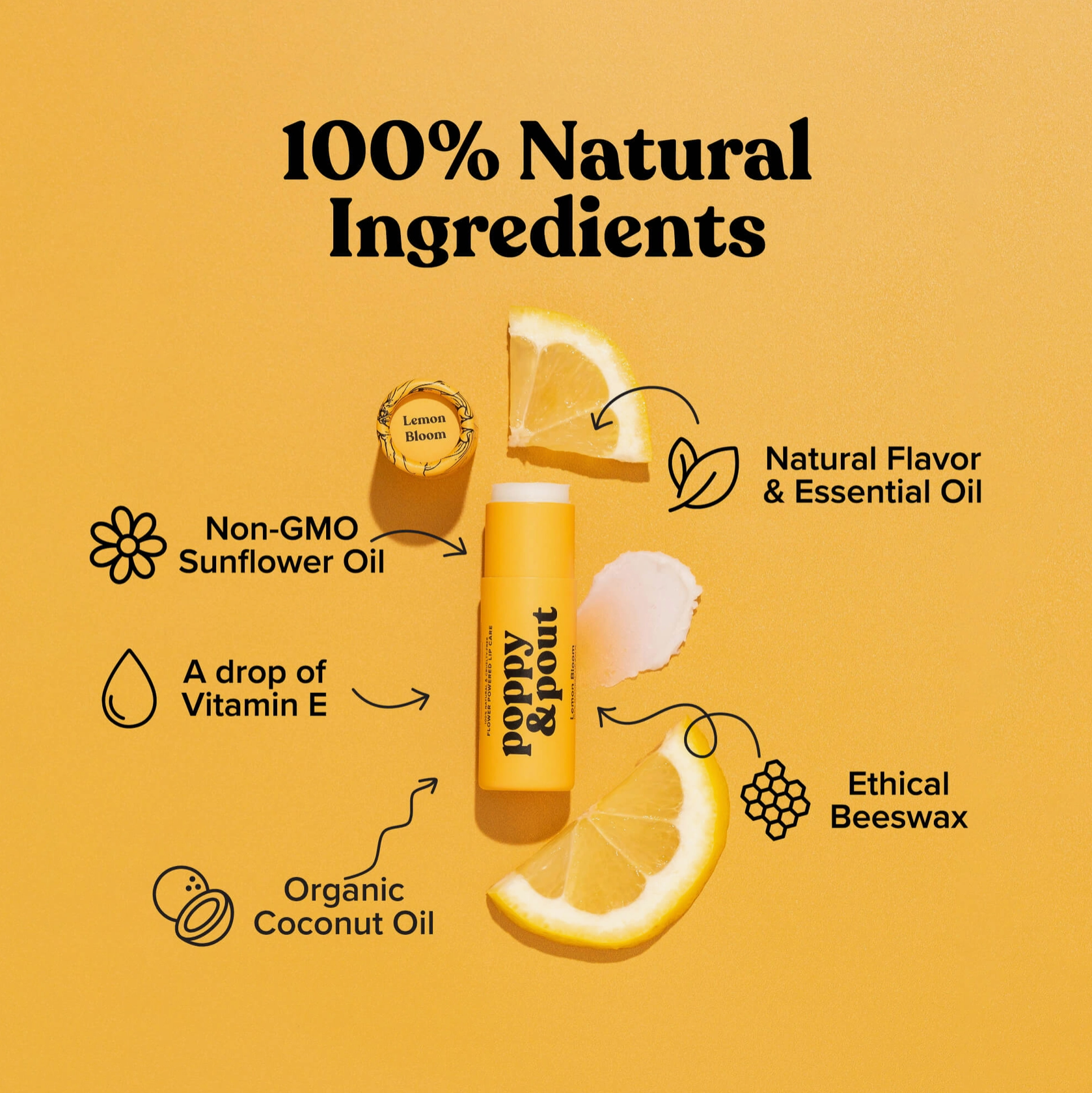 Lemon Bloom: Cocos Nucifera (Coconut) Oil, Cera Alba (Beeswax), Helianthus Annuus (Sunflower) Oil, Citrus Limon (Lemon) Oil, Vanilla Planifolia Extract, Tocopherol (Vitamin E)